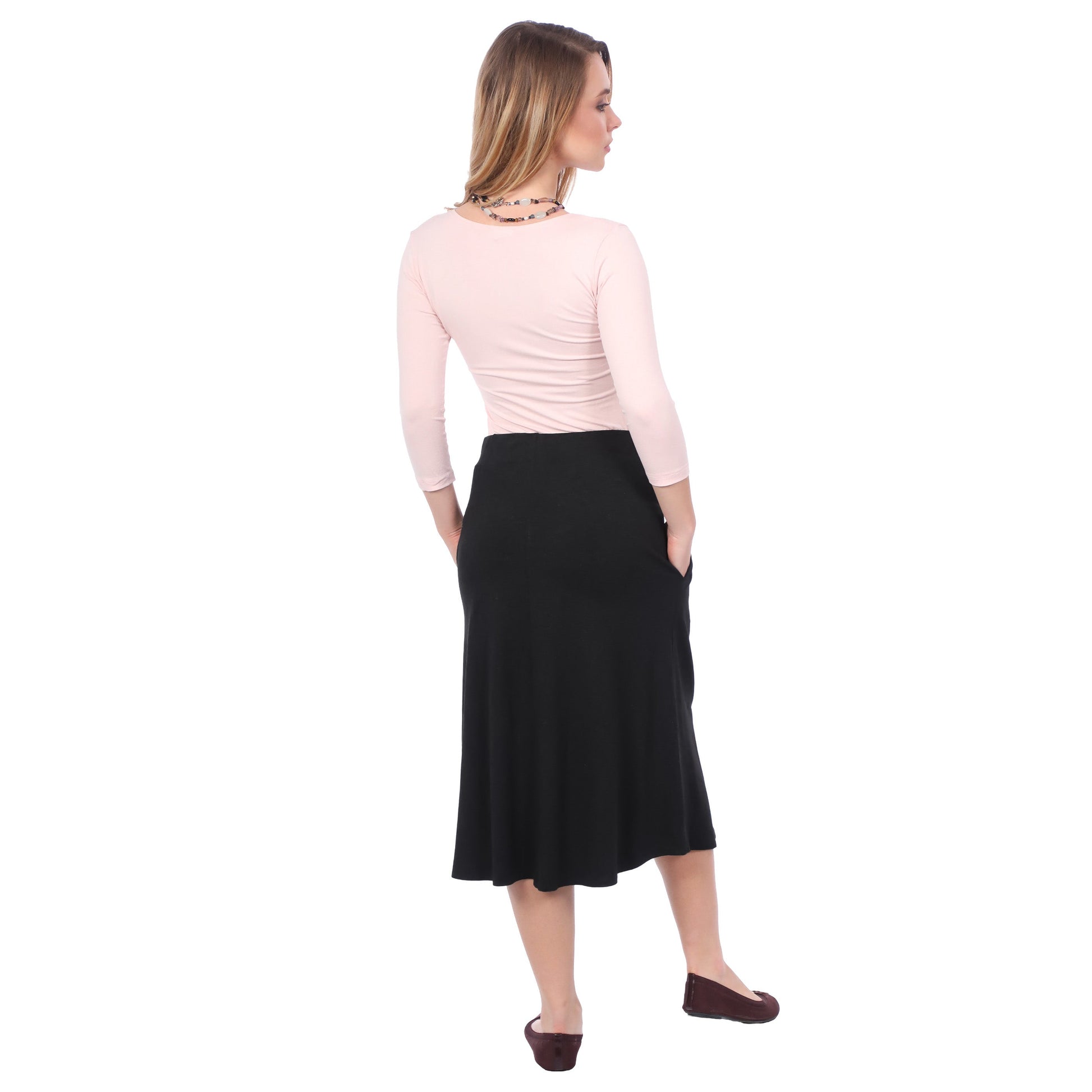 A comfortable everyday skirt that hits mid-calf, designed with a gentle A-line shape that suits most body types. The covered elastic waistband makes it easy to pull on, while two side pockets add practicality. Made from a soft, stretchy fabric blend that's perfect for work or casual wear.